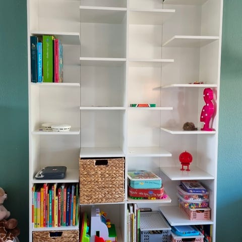Elementer af reolvæg, som er snedkerfremstillet. Den består af 5 dele samt bagbeklædning (se fotos):