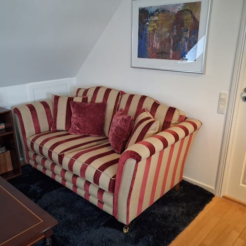 Anden arkitekt, Engelsk , Alstons Sofa, Klassisk Sofa i Guld-Bordeaux & Beige betræk Special produceret i England og importeret siden til DK se mere på alstons.co.uk/ men ellers rigtig fint håndværk og kvalitet hele vejen igennem denne sofa er en drøm at sidde i og måler cirka 2 meter i Bredden og i ryggen cirka 77 centimeter høj men puderne rager dog højere op da dette er målet på selve sofa rammen så der skal ligges lidt til i højden måske cirka 10-15 centimeter den måler cirka 1 meter i dybden altså udfra væggen om man vil. kommer fra et dyrefrit og ikke ryger hjem.