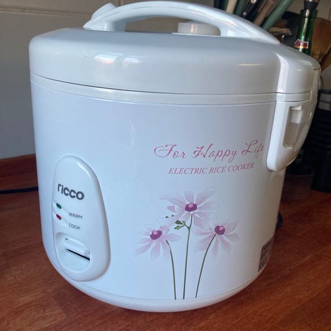 Midea riskoger i hvid farve med aftagelig indre gryde. Inkluderer låg, ske og elkabel. Designet til tilberedning af ris og suppe.