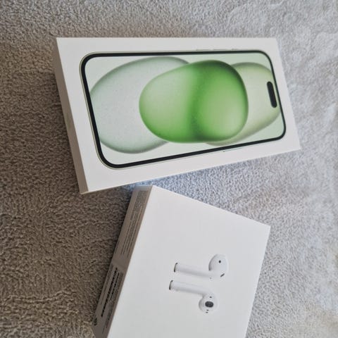 Apple iPhone 15 med 128 GB intern hukommelse. Enheden er sort og leveres med original emballage og opladerkabel.