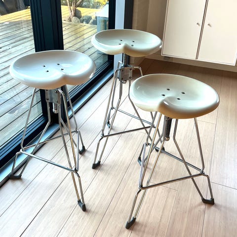 Dulton barstole - designet af Yasu Sasamoto, to sorte og en hvid. Alle har god patina, men de er i mekanisk god stand. Kan justeres til 70cm i højden. Prisen er for alle tre.
