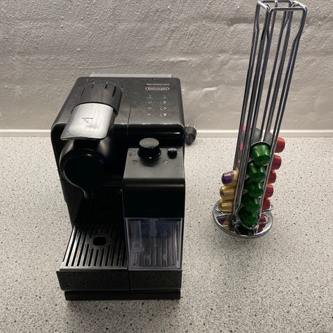 Fordele ved kaffemaskine med kapslerSkab café-oplevelser hjemme med De’Longhi Lattissima One EN510.B. Denne elegante kapselmaskine til Nespresso leverer espresso, cappuccino, latte og espresso macchiato med et tryk. Med indbygget mælkebeholder på 0,125 l kan du nemt skumme mælk til cremede mælkedrikke - perfekt til hverdagsforkælelse eller gæster.Nem betjening på køkkenbordetMaskinen er designet til placering på køkkenbordet og betjenes via intuitive touch-knapper. Den har 19 bar tryk for aromatisk espresso, vandtank på 1 l og beholder til brugte kapsler (kapacitet: 9 stk.). Auto-sluk efter 9 minutter hjælper med at spare strøm, og vandets hårdhed kan tilpasses for stabil smag over tid.Til dig der vil have kvalitet og bekvemmelighedEN510.B er idéel til dig, der ønsker hurtig kaffe uden besvær - fra enkel espresso til skønne mælkedrikke. Den sorte finish og kompakte mål gør den let at passe ind i køkkenet.Brygger espresso, cappuccino, latte og espresso macchiato med ét tryk19 bar tryk for fyldig aroma og cremaPraktisk mælkebeholder på 0,125 l til frisk mælkeskum1 l vandtank og beholder til 9 brugte kapslerAuto-sluk efter 9 min og justering af vandets hårdhedProdukttype: Espressomaskine til Nespresso-kapslerMaks. tryk: 19 barVandtank: 1 lMælkebeholder: 0,125 lBrugte kapsler: 9 stk.Betjening: Touch, ingen displayAuto-sluk: Efter 9 minEffekt: 1.400 WSpænding: 220 – 240 V, 50/60 HzPlacering: BordmodelFarve: SortMateriale: PlastMål (H × B × D): 38,5 × 19,5 × 35,5 cmVægt: 4,2 kg