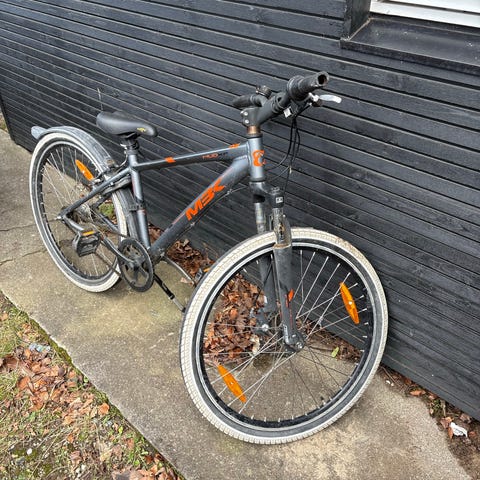 Har synlige brugsspor. Sædet er slidt, låsen er slidt og håndbremsen er slidt, men den cykler og virker derudover som den skal.