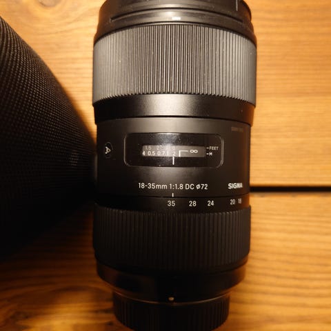 Sigma 18-35mm f/1.8 DC objektiv med zoomfunktion. Objektivet har en brændvidde på 18-35mm og en stor blændeåbning på f/1.8, hvilket gør det velegnet til fotografering i svagt lys og til at opnå lav dybdeskarphed.
