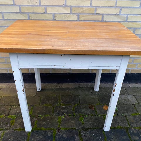 Ændre bord med to stole. Som jeg selv har afsyret sælges. Jeg skal flyttes så jeg har desværre ikke plads til det. Sæderne på stolen af polstrer hvilket jeg selv også har gjort. I bordet er der en skuffe hvor der er tre rum. Det har superfintstand. Kom og se det i Gentofte tæt på IKEA