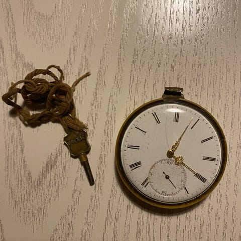 Sølv lommeur som sidder på en fleksibel lænke så det kan sættes i som et armbåndsur eller tages ud som et lommeur