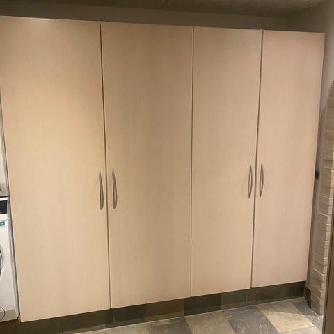 4 stk. Usamlet højskabe pakket i løsdele. Pallen og det samlede skab følger ikke med. Lågemodel Ask Melamin med abs kant.