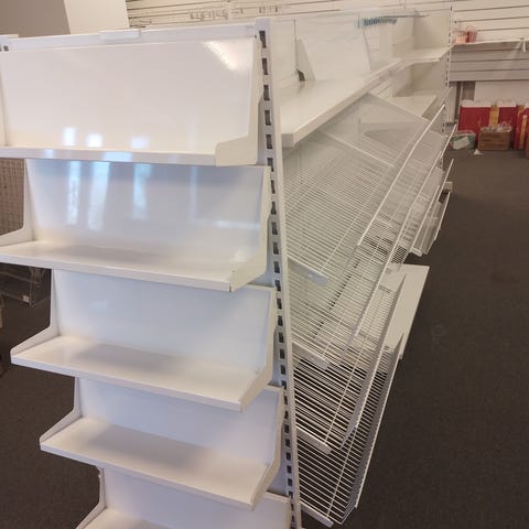 Stor og lang hvid varereol med mange muligheder. Mål: 3,70m (L) x 1,46m (H).