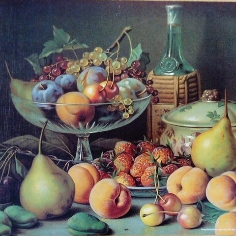 frugt billede, fint frugt billede i ramme med guld kant, er tungt, mål 26 cm bredt 20 cm højt, sendes eller hentes