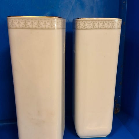 Vasen er grøn/hvid med motiv, Guld hanke og fint guld mønstre.