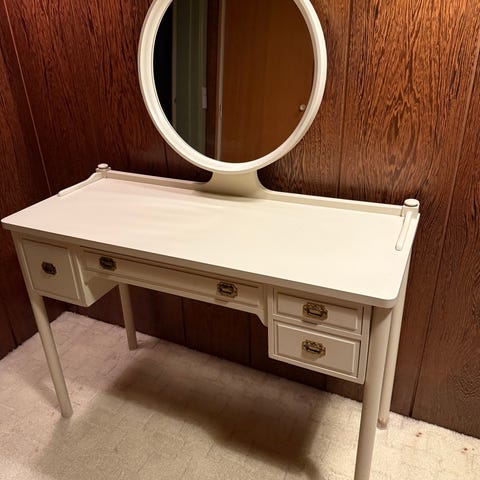 Rigtig fint sminkebord fra ca. 1972. Måler 42x100x79 cm (bredde/længde/højde), spejl 50 cm i diameter. Afhentes af køber i 8500 Grenaa
