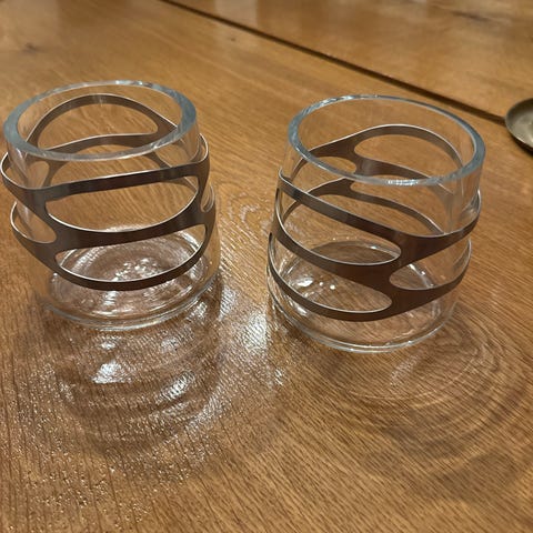 Stelton skåle lavet i rustfrit stål med indvendige aftagelige skåle i frostet glas. Skålene har en rund form og kombinerer materialer til funktionel brug.