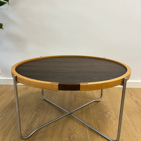 Wegner bakkebord i ubehandlet eg med en diameter på 62 cm. Bordpladen er gået op i limningen, derfor den lave pris, men den kan nemt limes usynligt sammen. Ellers i fin stand.