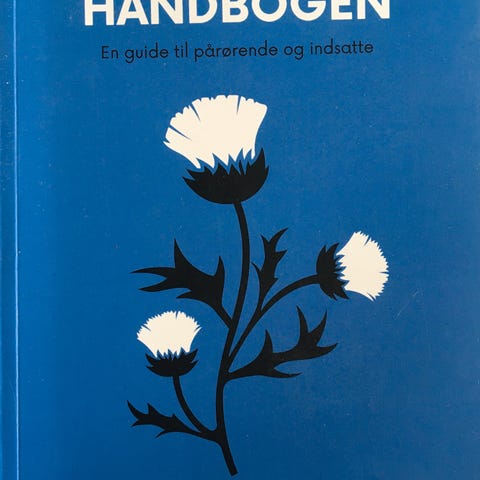 Andreas Rasmussen Fængsels Håndbogen bog. En guide til personale og pårørende. Blå omslag med illustration af hvide blomster.