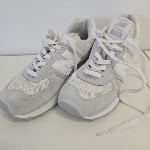 New Balance 574 børnesko til unisex i størrelse 32. Skoene er blå og designet til børn. Modellen har velcrolukning og en gummisål, velegnet til daglig brug. Købt i foråret 2025. Model classic 574. Tegn på slid.