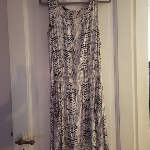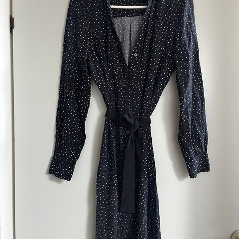 Mango hverdagskjole i størrelse S. Kjolen er blå og lavet af bomuld. Den har korte ærmer og et bælte i taljen. Velegnet til hverdagsbrug.
