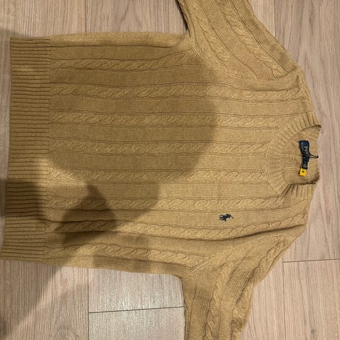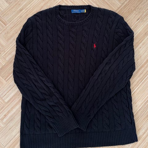 Ralph Lauren Polo trøje i sort farve, størrelse XS. Trøjen har et klassisk kabelstrikket mønster og logo broderet på brystet. Designet til kvinder og mænd.