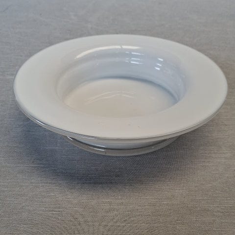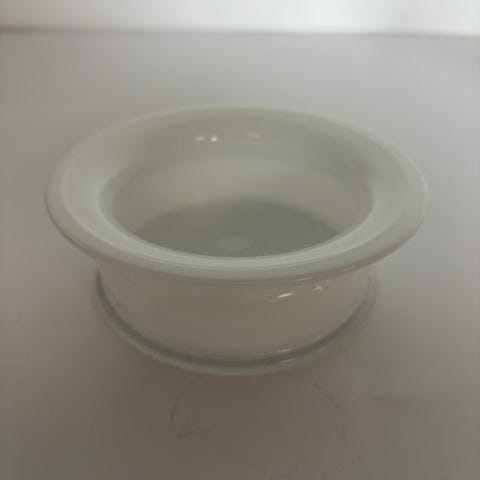 Skålen er old English rund med en glat, transparent overflade. Den er lavet af klart glas og har en let hævet kant.