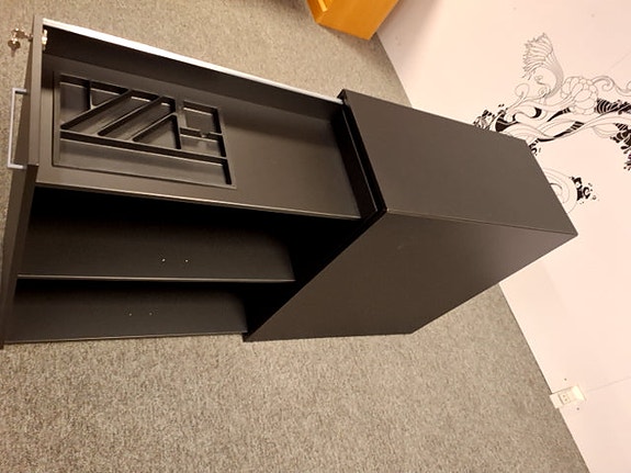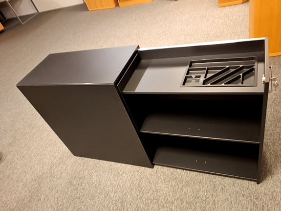 Jalusiskabet fra B8, har 2 hylder, hvor den ene er flytbar. Jalusilågen er låsebar.,Afhentes i:,Røde Kors Hjallerup (807),Bemærk at mail, chat og beskeder ikke besvares, og varen skal købes på knappen "Gå til varen"
