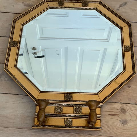 Spejlet har en dekorativ, gylden ramme med detaljerede udsmykninger. Det er rektangulært og glas.,Afhentes i:,Røde Kors Kolding (621),Bemærk at mail, chat og beskeder ikke besvares, og varen skal købes på knappen "Gå til varen"