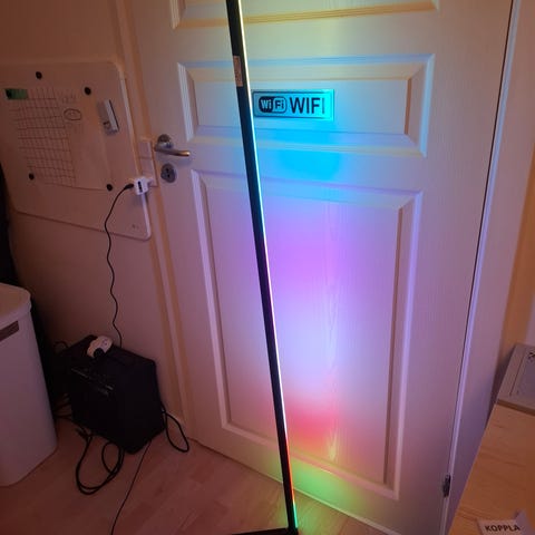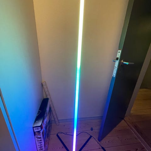 RGB-standerlampe med mange anvendelsesmuligheder til hjemmet i en kraftig kvalitet. Brug den som 'mood-light' i hjørnet af stuen, hvor du kan vælge mellem utallige farver, der vil kastes op på væggen og sikre hyggen. RGB-lampen har en musik-funktion, der betyder at du kan vælge mellem forskellige lysfunktioner, som så vil bevæge sig i takt med musik eller lyd som lampen hører gennem mikrofon i standeren. Lampen tilsluttes strøm via USB, f.eks. i en USB-port på din PC, PlayStation eller gennem en mobiloplader. Ledningen løber gennem foden (40 cm) og ud, hvilket giver 1,38 m fri ledning at gøre godt med. Foden er V-formet og måler 40 cm hver især.