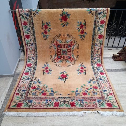 Avanos model uld-på-uld tæppe fra Tyrkiet, 150 x 241 cm, lavet i hånden med håndspundet uld og vegetabilsk farvet, i meget god stand, professionelt rengjort, vægt 9 kg, 21. århundrede. Klik på den blå "gå til varen" knap, for at købe eller byde på denne vare. Den samlede pris vil blive vist inden du afgiver dit bud.