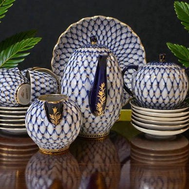Bring traditionen fra russisk kongelighed til din kaffestund med Lomonosov Porcelæns Kaffekop Cobalt Net. Dette porcelæns kaffestel er lavet på den russiske kejserlige porcelænsfabrik. Koppen og underkoppen er håndmalede og udsmykket med ægte 22-karat guld.