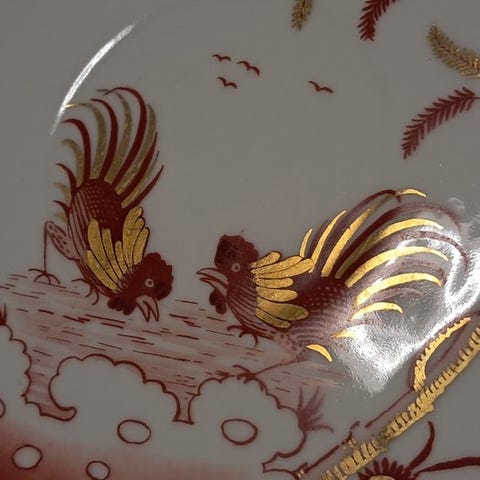Mærket: model 'Martha H&C', overgået af en krone (Heinrich & Co.) Selb Bavaria, serienummer '9742', Tyskland. Heinrich & Co. var en vigtig tysk producent af porcelæn. Dette specifikke mærke blev brugt mellem 1920 og 1939. Beskrivelse: Lyserøde roser, blå svungne linjer, helt hvid baggrund. Tilstand: Brudt. Kort historie: Franz