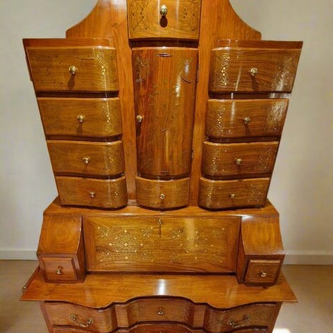 Møblet præsenterer sig i fint forarbejdet mahognitræ, med en øverste plade beklædt med bordeaux-plet, otte glidende skuffer med messing-navneskilte og en original lås med nøgle. På bagsiden er den papirklistrede producentetiket bevaret, hvilket vidner om ægthed og oprindelse.