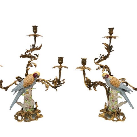 To unikke håndmalede papegøje-kandelabre, lavet af porcelain og bronze, fra Europa, i næsten ny tilstand, dateret 2020 eller senere, hver 37 cm høj og 16 cm bred og 16 cm dyb. Klik på den blå "gå til varen" knap, for at købe eller byde på denne vare. Den samlede pris vil blive vist inden du afgiver dit bud.