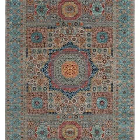 Det centrale medaillon med finurlige mønstre og den symmetriske arrangement af ornamenter giver tæppet en majestætisk udstråling. Farvetonerne i blå, turkis, beige og rustrød harmonerer fantastisk og skaber en elegant, varm atmosfære.