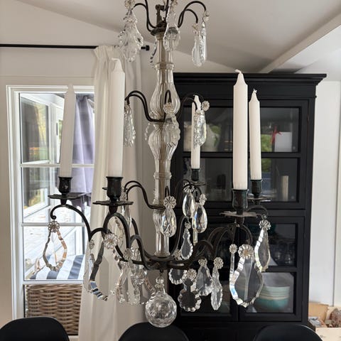 Dette er en engelsk georgisk hollandsk stil Queen Anne messingkrystal chandelier, også kendt som en kuglekrystal chandelier.