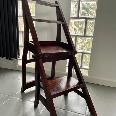 Fransk træ biblioteksstige/stol i god stand, 99 cm høj, 42 cm bred, 70 cm dyb når den er åben. Klik på den blå "gå til varen" knap, for at købe eller byde på denne vare. Den samlede pris vil blive vist inden du afgiver dit bud.
