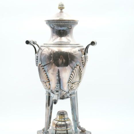 Antik Samovar Vittoriano fra England i Sheffield restaureret (se foto). Forgyldt med fint udskåret sølv, formet som et æg med låg og to håndtag. Der er initialerne for familien, stemplet med forskellige bogstaver i bunden af urnen, med smukke blomsterdekorationer, bladmotiver med relief og indskæringer. Grundfoden har fire kugleben. Stykket er i god stand. Der er ingen buler på kroppen.