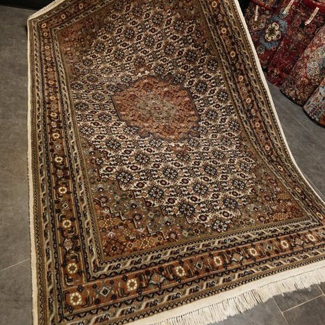 Håndvævet orientalsk tæppe fra Indien, størrelse 245 x 175 cm, uld på bomuld, i godt samlede stand med slid på kanterne og pletter, én genstand, med ægthedscertifikat. Klik på den blå "gå til varen" knap, for at købe eller byde på denne vare. Den samlede pris vil blive vist inden du afgiver dit bud.