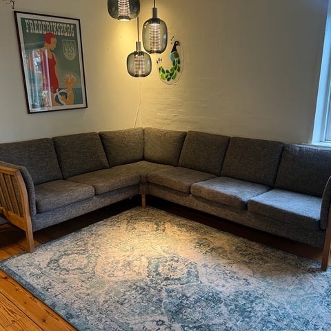 Fin mindre hjørnesofa 3 personer i en mørk grøn farve og et lille bønnebord i lys grøn farve fra Designer Zoo. Bord har et lille mindre hak i kanten . Ellers fremstår det som nyt.