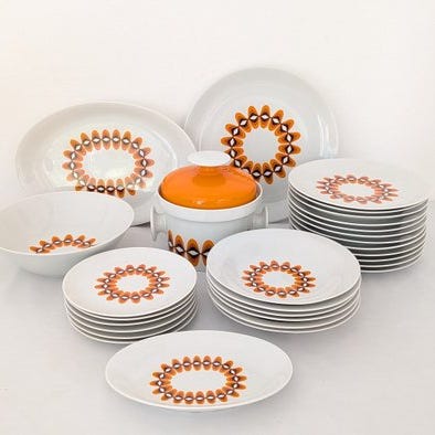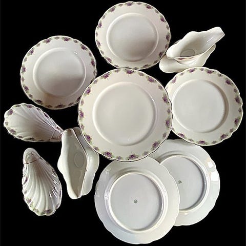 Dessertborden, 12 kopper og skåle, 12 middagsborde, 12 dybe tallerkener, 1 sukkerkande, 1 kaffekande, 1 mælkekande, runde og ovale terriner, 2 dybe store runde kage- / serveringsskåle og 2 ovale serveringsfade. Dette er en blanding af meget gamle stykker og nogle nyere. Meget komplet service.
