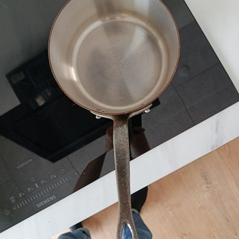 Door brug vil den kobberudvendige del blive misfarvet, hvilket giver panden et rustikt udseende. Hvis du ønsker at genoprette den oprindelige farve og glans, kan du bruge Mauviel Copperbril kobberpolish til at polere kobberet.