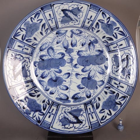 Stor Satsuma-keramikplade i Meiji-stil, diameter 45 cm, højde 8 cm, dybde 7 cm, vægt 4,285 kg, rigt forgyldt med en scene af samuraier i rustning. Klik på den blå "gå til varen" knap, for at købe eller byde på denne vare. Den samlede pris vil blive vist inden du afgiver dit bud.