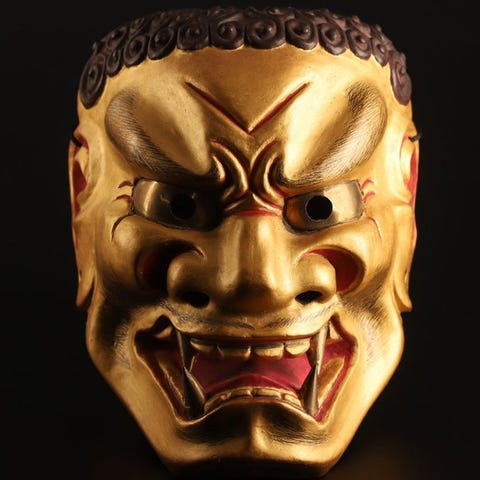 Finhakket og omhyggeligt udskåret Fudo Myo-o maske.