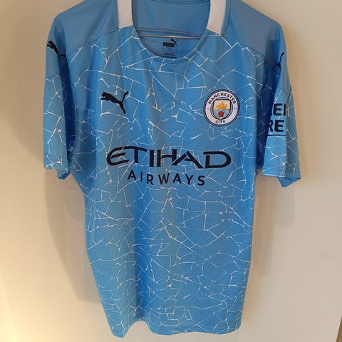 Jeg sælger denne Manchester City Hjemmebanetrøje fra 2023-24 sæsonen, hvor den engelske storklub skrev historie, ved at blive det første hold nogensinde til at vinde 4 Premier League titler på stribe