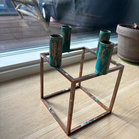 Den klassiske Kubus lysestage til ét lys, designet af Mogens Lassen. Materiale: kobber. Brugt men i god stand.