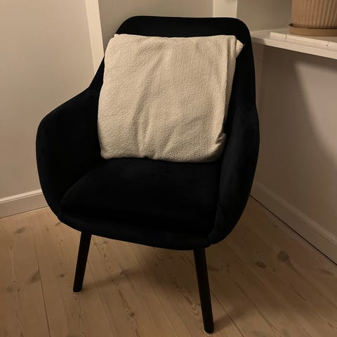 Behagelig, letplacerbar lænestol i moderne design. Ben af metal, betræk af velour og fyld af polyeter. Martindale >100.000.