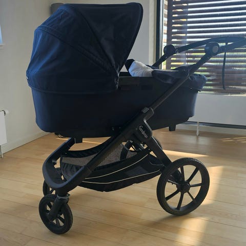 Medfølger luksus madras, myggenet, regnslag og BabyDan sele.
