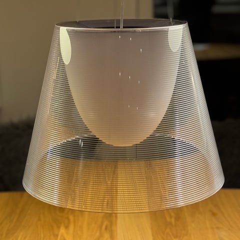 Flos lampe designet af Philippe Starck. Lampen har en gennemsigtig skærm med rillede detaljer og er velegnet til ophængning. Den er designet til at give funktionel belysning i forskellige rum. Her er den brugt i køkkenet. Tre af lamperne mangler glasindsats, men har ingen betydning for lys og funktionalitet. Sælges derfor billigt for 150kr stykket og alle fire for 500kr