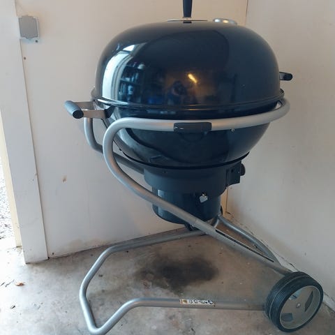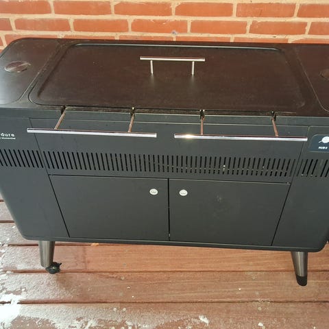 Mustang Kamado M kulgrill med keramisk konstruktion. Grillen har en rund form og er udstyret med to sidehylder. Den er designet til kulgrillning og har justerbare luftventiler til temperaturkontrol.