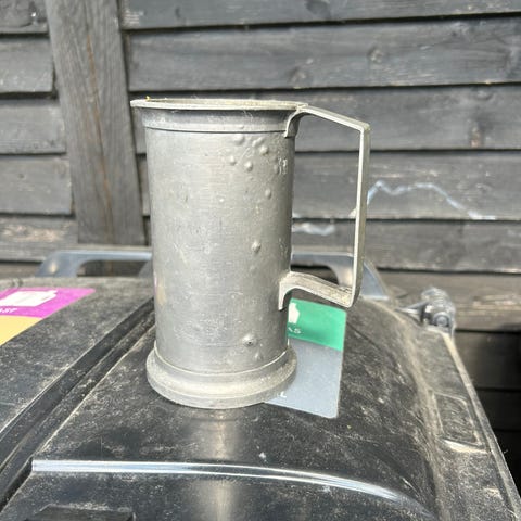 Smukt gammelt fransk tinkrus / vase i tin. Med stempel. Måler en liter. Perfekt til roserne fra haven. H: 18,5 cm.