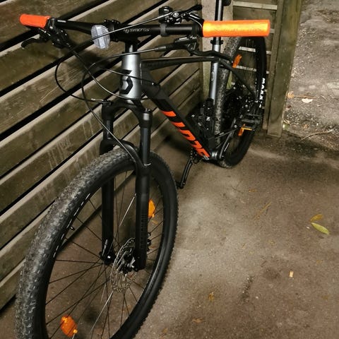 Scott Mountainbike til mand. Det er en størrelse large i stel. Og tommerne på hjulet er 27,5. Ny pris er omkring 7.500 tusind.