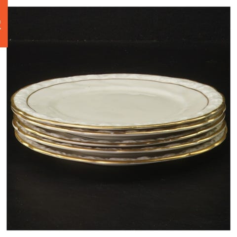 Sæt af seks flade porcelænstallerkener fra serien "Edelweiß', hver med en diameter på 16 cm. Tallerkenerne er hvide og har en elegant guldkant omkring kanten. De er ideelle til både hverdagsbrug og specielle begivenheder. Alle tallerkenerne har et klassisk design med en let rillet kant, der tilføjer en stilfuld touch til borddækningen. Produceret af porcelænsfabrikken JLMENAU.
