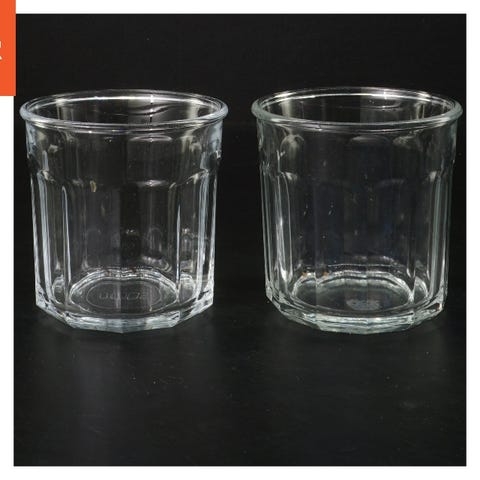 Disse billeder viser to gennemsigtige drikkeglas med en diameter på 10 cm og en højde på 9,5 cm. Glassene har en facetteret overflade og er fremstillet af klart glas. De bærer teksten 'Made in France' og nummeret '500' på bunden, hvilket tyder på en kapacitet eller modelnummer. Der er ingen synlige logoer eller brandnavne.